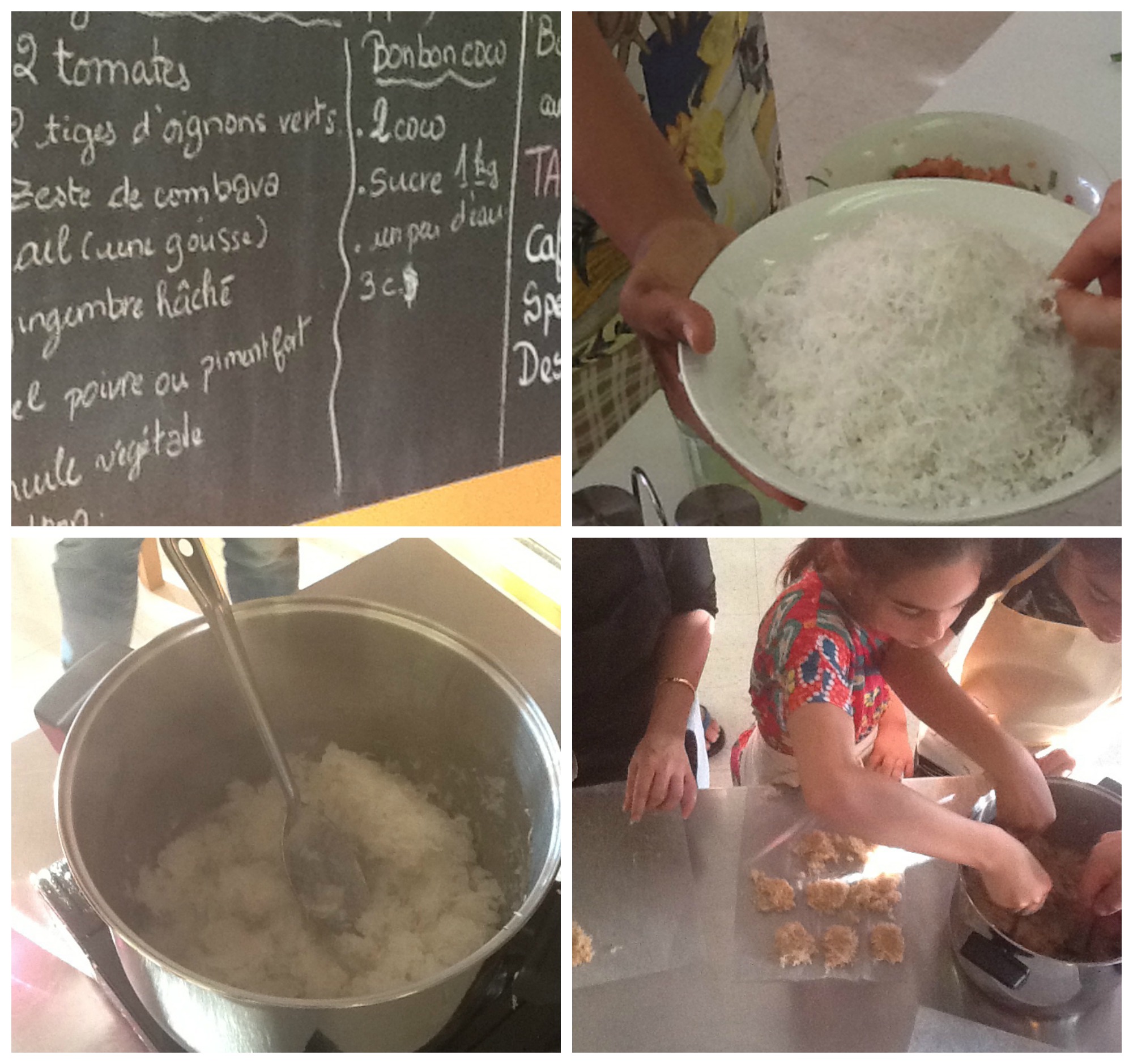 Et pour finir, le dessert, le bonbon coco! Pour le réaliser ( quantité: 30 boules): faire caraméliser un kilo de sucre, ajouter trois cuillères à sucre d’eau, incorporer la noix de coco râpée et faire remuer le tout jusqu’à l’obtention d’une pâte homogène! Sur une feuille de papier sulfurisée, prendre la pâte à la petite cuillère et réaliser des petites boules! C’est prêt!